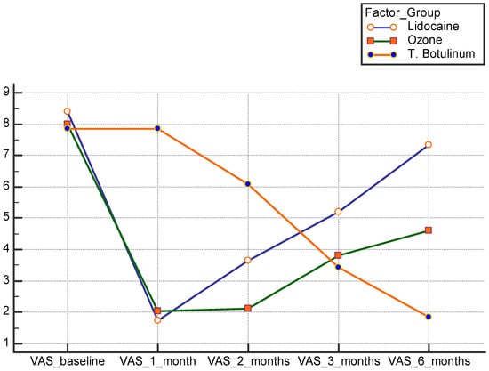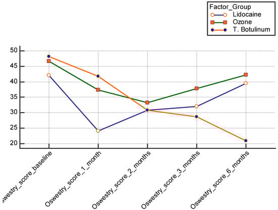 After two months, both VAS and ODI scores remained almost stable for the OZ group, while we noted a progressive increase in the LD group; the reduction in both scores started to occur in the BTX group after two months (Figure 2 and Figure 3). From the third month post injection, the values of VAS and ODI significantly decreased only in the BTX group compared to the LD and OZ groups (Figure 2 and Figure 3).