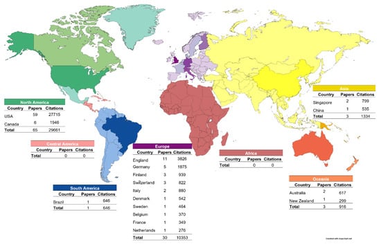The continent with the most articles on the list was North America (n = 65), followed by the European continent (n = 30), while Asia and Oceania both presented the same number of articles (n = 3). South America only published one, while Africa and Central America did not contribute to any article on the list. Specifically, USA was the country with the most appearances on the list (n = 59), followed by England (n = 11), and Canada (n = 6) (Figure 2).