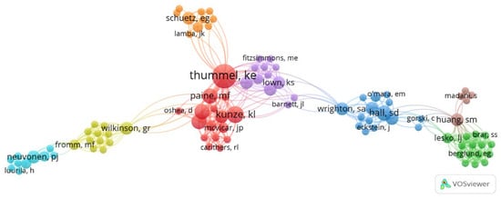 The list of the 100 most-cited articles on Midazolam composed of 556 authors. Based on the ranking of most-cited articles, it was observed that almost 50% of the papers had more than six authors (n = 44), while 24 papers with 3–4 authors appeared on the list, followed by 20 articles with 5–6 authors and 13 articles with 1–2 authors (Table 2). The major contribution as first author was Thummel, K.E. (n = 3), followed by Gorski, J.C.; Krauss, B.; Olkkota, K.T.; Paine, M.F.; and Schmiedlin-Ren, P. (n = 2). The author with the most articles on the list is Thummel, K.E. (n = 10; 4565 citation), followed by Kunze, K.L. (n = 5; 2174 citations), Perkins J.D. (n = 4; 1850 citations), Shen, D.D. (n = 4; 1850 citation), Paine, M.F. (n = 4; 1817 citations), and Hall, S.D. (n = 4; 1241). The other authors appeared in less than four articles on the list: a total of 16 authors contributed in three articles, 37 authors contributed in two articles, and 497 authors contributed in only one article. Figure 3 shows the clusters created with the network between the authors on the publication of papers on midazolam-related topics.