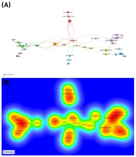 Network of co-occurrence and density-citation view of keywords used by the authors on the 100 most-cited studies about Midazolam. (A) Keywords network, in which clusters are represented by different colors and the lines indicate co-citation links between keywords; (B) Keywords- density visualization ranging from blue (lowest density) to red (highest density).
