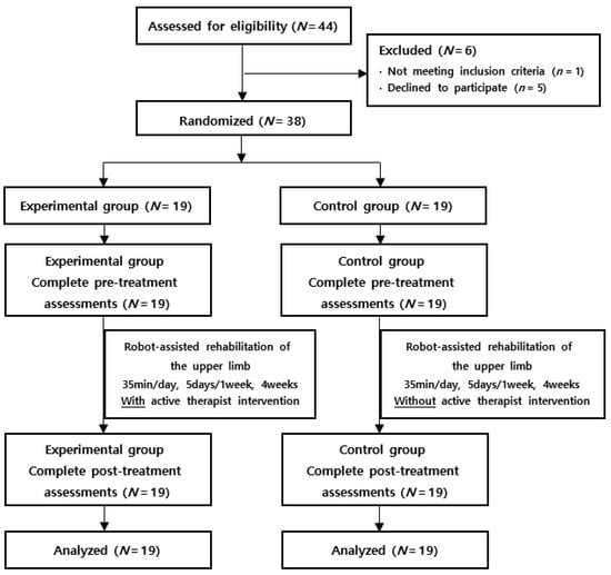 This study is a prospective, randomized controlled trial. Patients were randomly divided into two groups and received robot-assisted upper-limb rehabilitation for four weeks. In the experimental group, a therapist actively intervened during the treatment, while in the control group, a therapist only observed. Both groups underwent pre- and post-treatment evaluations (Figure 1). Randomization was processed using a centrally-generated, variable-sized block design made using a protected and concealed statistic program.