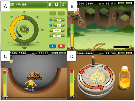 Treatment was performed for 4 weeks, 35 min per day, 5 days per week using an upper-extremity rehabilitation robot (Figure 2). Continuous passive motion (CPM) exercises (Figure 3A), isometric task-specific exercises (Figure 3B), range of motion continuous active motion (ROM CAM) exercises (Figure 3C), and 360° continuous active motion (360° CAM) exercises (Figure 3D) were performed. In both the experimental and control groups, the therapist helped the patient to be seated correctly before treatment, raised and fixed the hemiplegic upper-limb on the robot control panel, and taught the patient how to perform the task. When the robot training started in the experimental group, verbal and visual instructions using a stick were given if the therapist thought there was a problem with the patient’s treatment performance. We also allowed encouragement other than objective instructions. For example, when the patient loses concentration during training, the therapist points the stick at the screen or gives verbal instructions to induce concentration. In addition, when the patient was slow to perform the program, the therapist helped by using a stick to remind them of the method. In contrast, in the control group, the therapist observed the patients without any intervention.