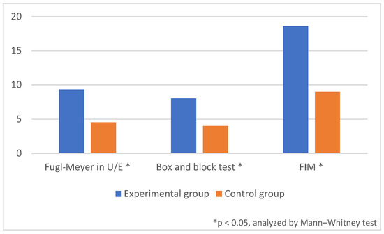 Comparison of the difference in measures before and after treatment: Fugl-Meyer in upper-extremities, box and block test, and functional independence measure (FIM). * p < 0.05, analyzed by Mann–Whitney test.