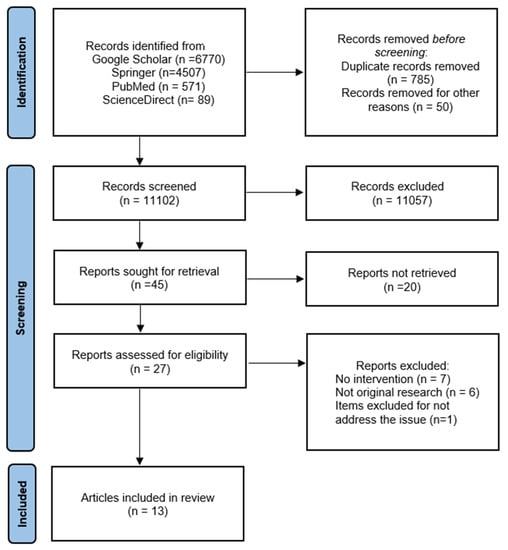 A PRISMA flow diagram for the article selection process in this review.