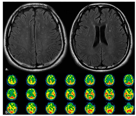 Case #1. (a) Brain MRI (T2/FLAIR). Multiple high signal intensity on bilateral cerebral hemisphere. (b) Brain SPECT. Markedly decreased perfusion in both frontal cortex and right basal ganglia.