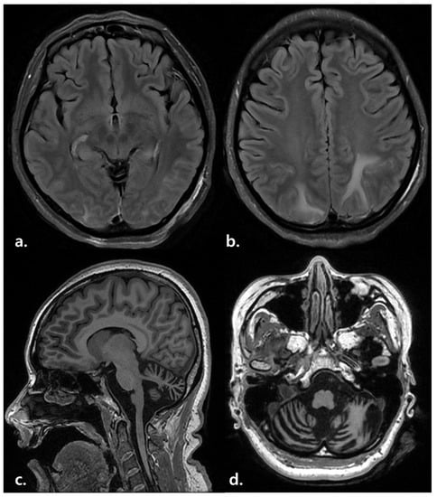 Case #2. (a,b) Brain MRI (T2/FLAIR). High signal intensity on bilateral mesial temporal and occipitoparietal lobes. (c,d) Brain MRI (T1). Significant isolated cerebellar atrophy.
