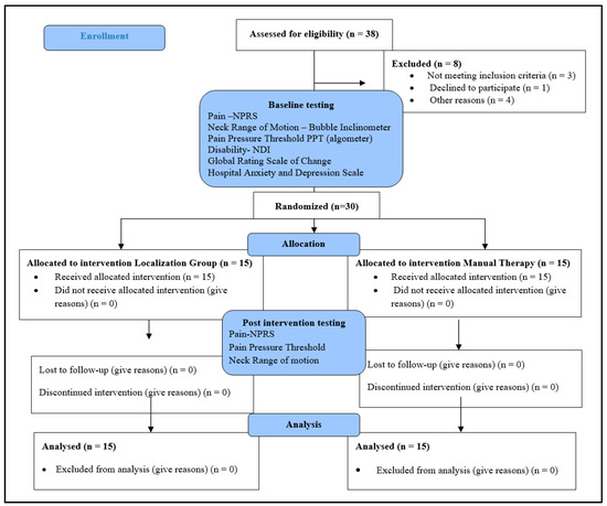 A sample of 30 participants (23 females and 7 males) aged 28.63 ± 12.49 years (ranging between 18 and 64 years) with non-specific neck pain who met the inclusion criteria were randomly assigned into two equal groups (n = 15); the LT group (11 females, 4 males aged 26 ± 10 years) and the MT group (12 females, 3 males aged 31 ± 15 years). Figure 3 illustrates the CONSORT flow chart diagram. There were no differences in participants’ demographics (age, height, weight or BMI), in clinical characteristics such as duration of pain, or in measurements/scores of the NPRS, ROM, PPT, NDI or HADs between the groups at baseline (p > 0.05) (Table 1, Table 2 and Table 3).