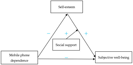Mobile phone dependence will negatively influence the individual’s health, such as subjective well-being [20,21,22]. Mobile phone dependence was negatively associated with self-esteem, and the higher the degree of mobile phone dependence, the lower the self-esteem [20,37,38]. Those individuals with high subjective well-being might also have high self-esteem [35,36]. Mobile phone dependence may reduce the individual’s self-esteem and then reduce the individual’s subjective well-being. Social support has an important positive effect on subjective well-being [39,40,41], and there are also differences in subjective well-being among individuals with different social support [42,43].