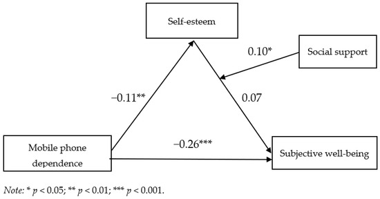 After confirming that mobile phone dependence negatively predicted subjective well-being, the mediator (self-esteem) and the moderator (social support) were incorporated to construct a moderated mediation model to further explore the mechanisms of mobile phone dependence on subjective well-being.