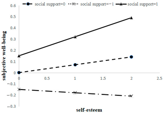 Although the results confirm the moderated mediation model, the moderating effect needed further analysis. In order to clarify the specific mechanisms of the moderator (social support), self-esteem was used as the abscissa; subjective well-being was used as the ordinate, and the Z scores of social support were equal to 1, 0, and −1 to make an interaction graph (see Figure 3). The slope in Figure 3 intuitively reflects the effect of self-esteem on subjective well-being.