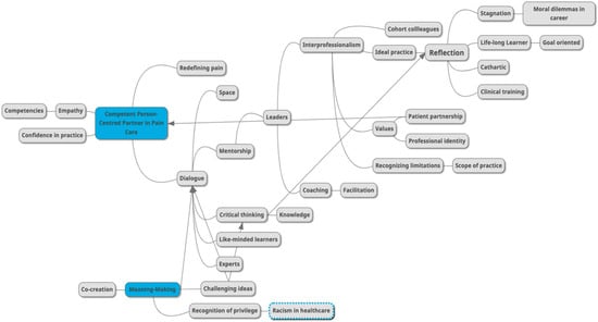 The selective reading approach developed by van Manen (2016) is used for data analysis. In selective reading, the text is read several times and explored to identify what is being revealed about the phenomenon being described through the perspective of the researcher []. The analysis also included creating a mind map using an online mind-mapping generator, which was shared with the second and third authors. See Figure 1 for Mind Map, which was used to demonstrate changing ideas over time, and was used to visually organize the findings into themes. According to van Manen (2016), phrases should be copied and then saved as possible rhetorical ‘gems’ to support the researcher while writing the phenomenological text []. The text that was considered central to descriptions of the lived experience of participating in the IPM program was highlighted by researchers, organized into a spreadsheet, and then sorted into themes. The authors engaged in transparent dialogue about the unfolding interpretations and considered if they could be interpreted otherwise but confirmed that the data and subsequent results were authentic and trustworthy. These themes were developed iteratively, with the final structure constructed through consensus of all authors and with the use of rigor, which consisted of peer debriefing and reflexive journaling.