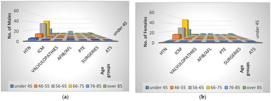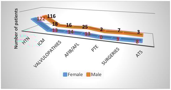 For the 356 patients with SARS-CoV-2 infections who were admitted between 1 July 2020 and 31 June 2021 to the cardiology clinic, the main cardiologic diagnosis (as the reason for admission) is shown in Figure 1 and Figure 2, where it is easy to see that HBP was the reason for hospitalization in 238 patients (67%, with a difference of 5% more for the female sex). We also noted that the age interval of 66–75 years represented a percentage of 43.27%, with females having 11 cases more than males. The 2nd-ranked age group was 56–65 (27.73%), where more males were found, followed by the 76–85 age group, with a percentage of 17.64%, with a slightly higher number of females.
