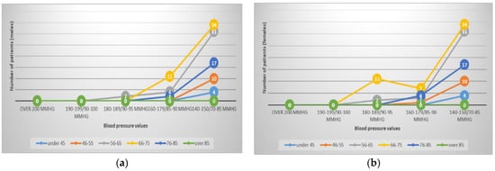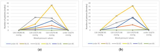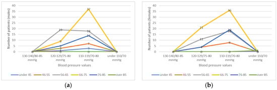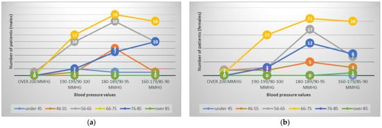 BP values on the 14th day of admission, graphically represented by age and sex: (a) BP values for men; (b) BP values for women.