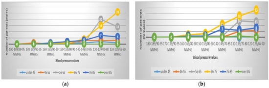 BP values on the 7th day of admission, graphically represented by age and sex: (a) BP values for men; (b) BP values for women.