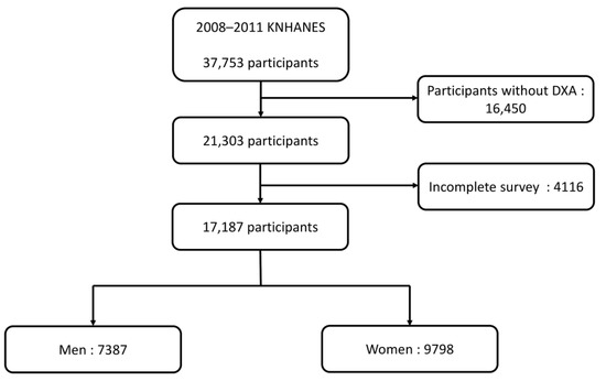 In the 2008–2011 KNHANES, 37,753 participants completed RA-related questionnaires. We excluded 16,450 individuals who did not undergo dual-energy X-ray absorptiometry (DXA) and 4116 individuals who did not complete the health survey. Thus, the final sample size of our study was 17,187 participants, of which 7389 were men, and 9798 were women (Figure 1).