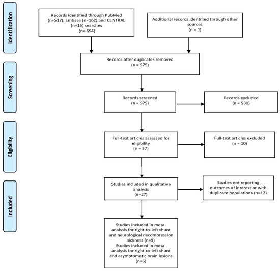 The literature search yielded 575 potentially eligible studies after removing duplicates. After screening titles and abstracts, 27 articles were retrieved for full-text evaluation. As shown in the PRISMA flow diagram, fifteen observational studies met the prespecified inclusion criteria. (Figure 1) [12,17,18,19,26,27,28,29,30,31,32,33,34,35,36,37]. One study reported both primary outcomes and was included in both analyses [35]. The study by Germonpre et al. (2021) was not included in our primary analysis because it provided information about the overall incidence of DCS and not NDCS separately [31]. Overall, ten studies were included in the analysis regarding the association between RLS and NDCS [12,26,27,28,32,33,34,35,36,37], whereas six studies were included in the analysis on RLS prevalence in healthy divers with asymptomatic brain lesions [17,18,19,29,30,35]. All included observational studies were assessed as having at least a moderate risk of bias according to the QUIPS tool (Supplementary Table S1).