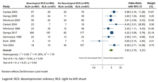 Nine studies reported results on the association between RLS and NDCS [12,26,27,32,33,34,35,36,37]. The total number of patients included in the final dataset was 1902, 954 of whom had a history of NDCS and 876 divers with no history of NDCS. The mean age was 46 years, and the male population accounted for more than 61% of the sample. The most common predisposing factors for NDCS were provocative diving behavior (i.e., rapid ascent, table limit violations, missed decompression stops, and repetitive dives) and concurrent lung disease (Table 1). The overall frequency of RLS in divers with NDCS was 62.6% (597/954), compared with 27.3% (239/876) in divers without NDCS. In this meta-analysis of 10 studies, divers with RLS were at higher risk of NDCS compared to divers without RLS (OR: 3.83; 95% CI: 2.79–5.27; p < 0.001; I2 = 41.4%; Figure 2).