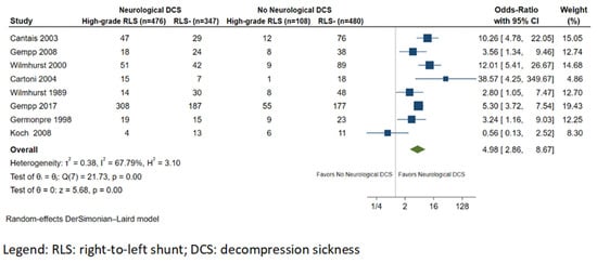 Eight studies reported information on the degree of RLS in study participants. The prevalence of large RLS in divers with NDCS was 51.4% (476/926), whereas in the control group, the prevalence was 16.0% (108/674). Overall, the risk of NDCS was higher in those with high-grade RLS (OR: 4.98; 95% CI: 2.86–8.67; p < 0.001 I2 = 67.8%; Figure 3) compared to RLS of any grade.