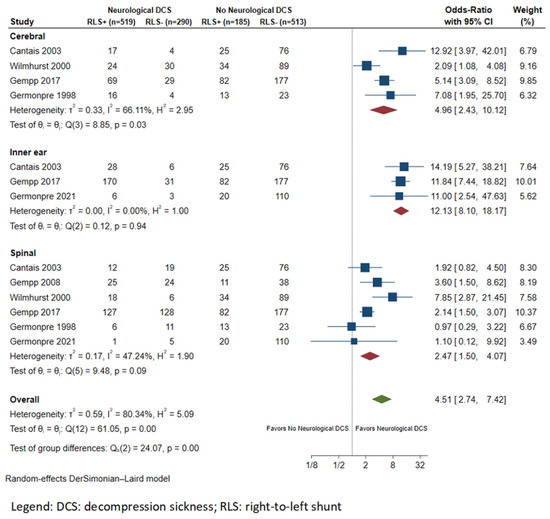 Objective: The aim of this study was to assess the association between the presence of a right-to-left shunt (RLS) and neurological decompression sickness (NDCS) and asymptomatic brain lesions among otherwise healthy divers. Background: Next to drowning, NDCS is the most severe phenotype of diving-related disease and may cause permanent damage to the brain and spinal cord. Several observational reports have described the presence of an RLS as a significant risk factor for neurological complications in divers, ranging from asymptomatic brain lesions to NDCS. Methods: We systematically reviewed the MEDLINE, Embase, and CENTRAL databases from inception until November 2021. A random-effects model was used to compute odds ratios. Results: Nine observational studies consisting of 1830 divers (neurological DCS: 954; healthy divers: 876) were included. RLS was significantly more prevalent in divers with NDCS compared to those without (62.6% vs. 27.3%; odds ratio (OR): 3.83; 95% CI: 2.79–5.27). Regarding RLS size, high-grade RLS was more prevalent in the NDCS group than the no NDCS group (57.8% versus 18.4%; OR: 4.98; 95% CI: 2.86–8.67). Further subgroup analysis revealed a stronger association with the inner ear (OR: 12.13; 95% CI: 8.10–18.17) compared to cerebral (OR: 4.96; 95% CI: 2.43–10.12) and spinal cord (OR: 2.47; 95% CI: 2.74–7.42) DCS. RLS was more prevalent in divers with asymptomatic ischemic brain lesions than those without any lesions (46.0% vs. 38.0%); however, this was not statistically significant (OR: 1.53; 95% CI: 0.80–2.91). Conclusions: RLS, particularly high-grade RLS, is associated with greater risk of NDCS. No statistically significant association between RLS and asymptomatic brain lesions was found.