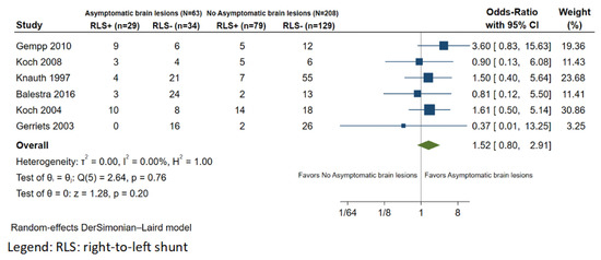 Six observational studies were included in the analysis regarding the association between RLS and the occurrence of asymptomatic brain lesions [17,18,19,29,30,35]. The total number of patients included in the analysis was 271. The mean age was 35.4 years, and 88.6% of patients were males. TCD was the primary modality for the assessment of RLS. The baseline characteristics of this population are summarized in Table 2. A total of 69 divers (33.2%) were found to have asymptomatic brain lesions on MRI. Regarding RLS status, 42.0% (29/69) of divers with asymptomatic brain lesions were found to have RLS; in the group without asymptomatic brain lesions, an RLS was present in 38.0% (79/208) of divers. In the meta-analysis of six studies, we did not find an association between RLS and asymptomatic brain lesions in otherwise healthy divers (OR: 1.53; 95% CI: 0.85–2.91; p = 0.201; I2 = 0%; Figure 5).