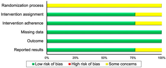 For the randomization process, all the eligible RCTs displayed some concerns for risk of bias; for intervention assignment one RCT [28] demonstrated some concerns and the remaining two [23,25] low risk of bias. For intervention adherence, one RCT [25] displayed some concerns and the other two [23,28] low risk of bias. For missing data and outcome risk of bias all RCTs demonstrated low risk, while for reported results one RCT [25] displayed some concerns and the other two [23,28] demonstrated low risk of bias.