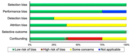 Regarding the CT and epidemiological included studies, in the selection bias all studies demonstrated low risk. For performance bias, two studies [31,33] were not applicable and six studies [21,22,29,30,32,34] displayed low risk of bias. For detection bias, two studies [30,33] displayed low, and the remaining six, some risk of bias concerns. In the attrition bias, three studies [21,29,30] demonstrated low, and the remaining five, some risk of bias concerns. In the selective outcome, all studies demonstrated low risk of bias. Finally, in the confounding risk, three studies [22,29,31] displayed high risk, three [21,30,32] demonstrated low risk, and two studies some risk of bias concerns. The risk of bias outcomes can be found in Table 1, while a summary of the risk of bias can be found in Figure 1 for RCT and in Figure 2, for the CT and epidemiological studies.