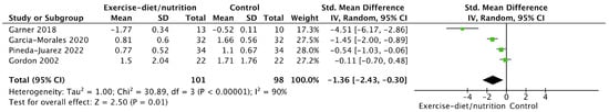 For eligible studies that did not provide numerical data to be used for a meta-analysis, a summarized narrative data synthesis was adopted. For studies suitable for meta-analysis, a random-effect model was used to account for heterogeneity due to differences in study populations, disease characteristics, diet/nutrition and physical activity/exercise interventions/measurements, and study duration. All meta-analyses were conducted using RevMan 5.4.1, 2020 software (The Cochrane Collaboration, Oxford, UK) [19]. We used an inverse variance, continuous method to calculate mean differences (MD) either between a combined intervention of diet/nutrition and physical activity/exercise and a control group, or between baseline and post intervention values. In cases where calculation units were different for the variable involved in a meta-analysis, a standardized mean difference (SMD) approach was used [15]. We identified four main variables suitable for meta-analysis: weight (kg), Health Assessment Questionnaire (HAQ) score, erythrocyte sedimentation rate (ESR; mm/1st h), and CRP (mg/L). The HAQ represents patients-oriented outcome assessment, which is based on five dimensions: disability, pain, medication effects, costs of care, and mortality [20].