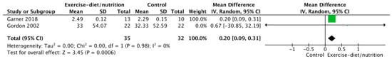 We found that ESR (mm/1st h) is increased as a result of a combined intervention of diet/nutrition and physical activity/exercise (MD = 0.20, CI = 0.09–0.31, I2 = 0%, Z = 3.45, p < 0.01, Figure 4), in RA patients.