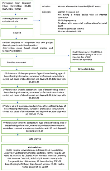 The study sample will be compiled during the third trimester of pregnancy in the different primary care midwife consulting rooms of each of the participating centers. After receiving the envelope, the women will read the QR code with their mobile device and will be registered in the nursing platform created for the study, after accepting the privacy policy statement. Both the intervention group and the control group will undergo an initial survey to record sociodemographic data, previous experience with BF, and the probable date of delivery. In addition, two self-administered questionnaires will be completed—one on HL (HLS-EU-Q16) [34] and another on health-related quality of life (EQ-5D-5L) [35]—through the e-mail account registered on the platform.