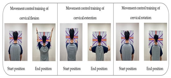 To apply the movement control training of cervical flexion, the participant was asked not to move the head while gazing toward the front and below and maintaining the head and lower cervical spine in normal curvature; they had to lift both arms completely to a 180° shoulder flexion and then bring the arms back down to the sides of the body [28,29,34].