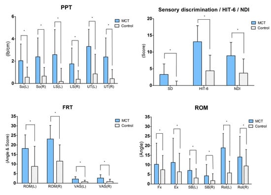 Result of post-hoc analysis between both groups. Values are means ± SD. * Significant difference between groups (p < 0.05). Abbreviations: MCT: Movement control training using a laser device; So: Subocciptalis; LS: Levator scapulae; UT: Upper trapezius; HIT-6: Headache impact test-6; NDI: Neck disability index; FRT: Flexion rotation test; ROM: Range of motion; VAS: Visual analog scale; Fx: Flexion; Ex: Extension; SB: Side bending; Ro: Rotation.