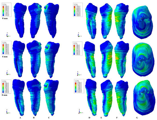 A total of 0.6 N of translation. Comparative shear stress display between the tooth structure in (A) lingual, (B) distal–vestibular, and (C) mesial–lingual view, and the dentine component in (D) lingual, (E) distal–vestibular, (F) mesial–lingual, and (G) apical view.