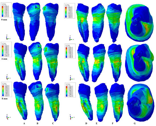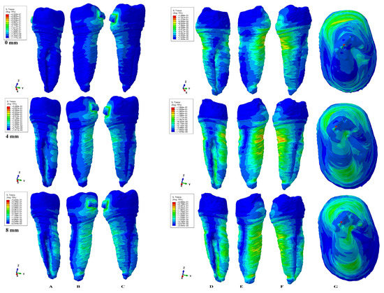 A total of 0.6 N of extrusion. Comparative shear stress display between the tooth structure in (A) lingual, (B) distal–vestibular, and (C) mesial–lingual view, and the dentine component in (D) lingual, (E) distal–vestibular, (F) mesial–lingual, and (G) apical view.