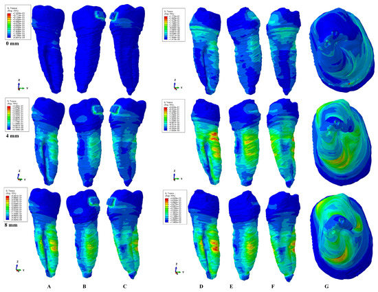 A total of 0.6 N of rotation. Comparative shear stress display between the tooth structure in (A) lingual, (B) distal–vestibular, and (C) mesial–lingual view, and the dentine component in (D) lingual, (E) distal–vestibular, (F) mesial–lingual, and (G) apical view.