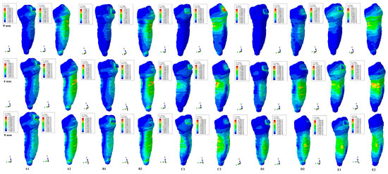 The biomechanical behavior of the tooth in intact surrounded support tissues caused maximum stress to occur in enamel around the bracket area for all movements and the two forces. However, with the progression of the periodontal support reduction process, the biomechanical behavior changed so that the maximum stress was additionally displayed in the cervical (4 mm loss) and middle third of the dentin–cementum of the root (8 mm loss), where the bone level is positioned, e.g., Figure 3, Figure 4, Figure 5, Figure 6, Figure 7 and Figure 8.
