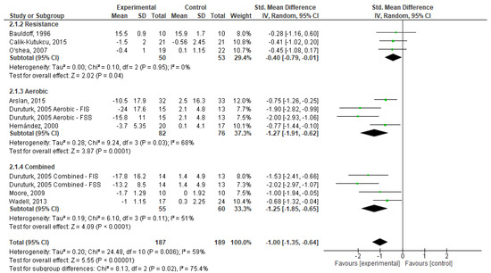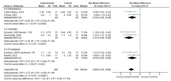 From Figure 4, we can observe that exercise, in general, had a significant effect on dyspnoea (SMD = −0.88; 95% CI, −1.16 to −0.60; p < 0.001). We also found that RE (SMD = −0.79; 95% CI, −1.24 to −0.34; p < 0.001) and CE (SMD = −0.79; 95% CI, −1.29 to −0.29; p < 0.001) had a medium and significant effect and that AE had a large and significant effect (SMD = −1.11; 95% CI, −1.64 to −0.58; p < 0.001) on dyspnoea. Weights are from fixed effects analysis once heterogeneity was not observed (I2 < 50%, p > 0.05).