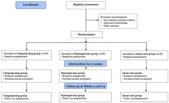 A randomized, assessor-blind, three-arm, parallel-group, multicenter clinical trial will be conducted at the Kyung Hee University Korean Medicine Hospital, Daejeon Korean Medicine Hospital of Daejeon University, and Semyung University Korean Medicine Hospital in the Republic of Korea from June 2022 to December 2023. The trial includes 6 weeks of medication or usual care (week 0 to 6) and a follow-up of 18 weeks (from week 6 to 24), following 2 weeks of a run-in period after the screening visit (