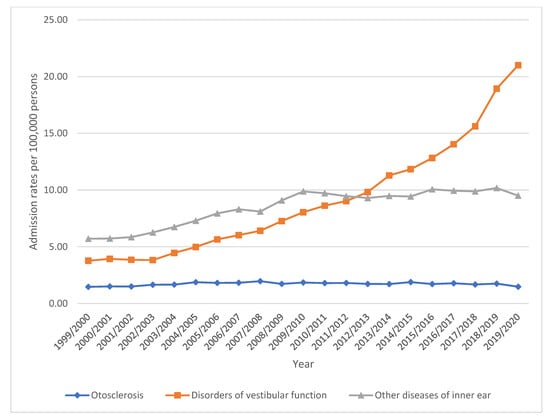Over the study duration, a tremendous increase in disease of the inner ear hospital admission rates was seen in disorders of vestibular function by 457.5%. Besides, hospital admission rates for other diseases of the inner ear and otosclerosis were increased by 66.5% and 0.7%, respectively (Figure 1 and Table 2).