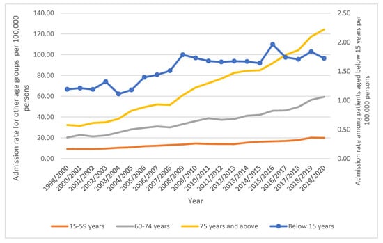 Most hospital admissions were for the age group 15–59 years (42.3%) and the age group 75 years and above (28.8%), Table 4. The lowest increase in the rate of hospital admission was observed among patients aged below 15 years (44.6%). The highest increase in the rate of hospital admission was observed among patients aged 75 years and above (284.9%) [from 32.29 (95%CI 30.51–34.07) in 1999 to 124.28 (95%CI 121.24–127.31) in 2020 per 100,000 persons]; Table 3. Figure 2 presents admission rates stratified by age group.