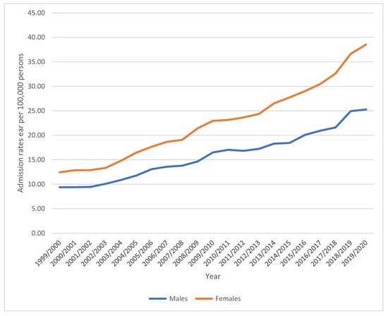 A total of 228,733 admission episodes were reported during the study timeframe. Females contributed to 59.6% of the total number of admissions (136,224 admission episodes), with an annual average of 6486 episodes. The female admission rate rose by 210.1% [from 12.43 (95% CI 12.01–12.85) in 1999 to 38.54 (95% CI 37.84–39.24) in 2020 per 100,000 persons]. The male admission rate increased by 169.6% [from 9.37 (95% CI 9.00–9.75) in 1999 to 25.26 (95% CI 24.69–25.84) in 2020 per 100,000 persons] (Figure 3).