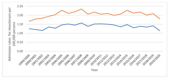 While middle ear diseases are clearly diseases of children [], the inpatient inner ear disorders were disorders of older age (42.3% among 15–59 years, and 28.8% among older than 75 years of age). Hospital admissions due to otosclerosis were more common among 15–59-year-old patients; this can be confirmed by a previous study, which found most participants (62%) reported the age of onset of the otosclerosis disease in the third and fourth decades []. Patients with otosclerosis, which is a condition that causes conductive hearing loss because of abnormal bone growth in the middle ear, might be admitted to hospitals for surgical intervention, diagnostic testing, monitoring of the disease, and rehabilitation after treatment []. On the other hand, hospital admission rates for disorders of vestibular function and other diseases of the inner ear in our study were more common among the elderly. Consistent with the study of Ekwall et al. (2016), which reported that inner ear-related dizziness is one of the most frequent chief complaints among elderly patients presenting in the ED and that such patients often call for an ambulance []. The observed increments in hospital admissions at older ages, illustrated in the present study, can be explained by age-related declines in the function of the vestibular system and its consequences of imbalance and falls. Hülse and colleagues (2019) [], for instance, reported that the prevalence of vestibular disorders increased with age and peaked between 74 and 94 years. Previous literature has identified that vestibular disorders increase with age [,,]. Moreover, it is possible that gout, a condition that is more commonly observed in elderly individuals, is associated with vestibular disorders by mechanisms such as purine crystal deposits accumulation from free-floating otoconial debris in the semicircular canals, gelatinous matrix inflammation linked to otoconia, the production of harmful reactive oxygen species, and the release of inflammatory mediators resulting from elevated serum uric acid levels [].