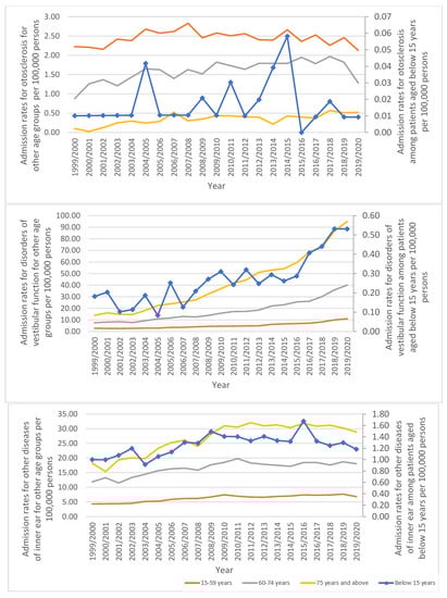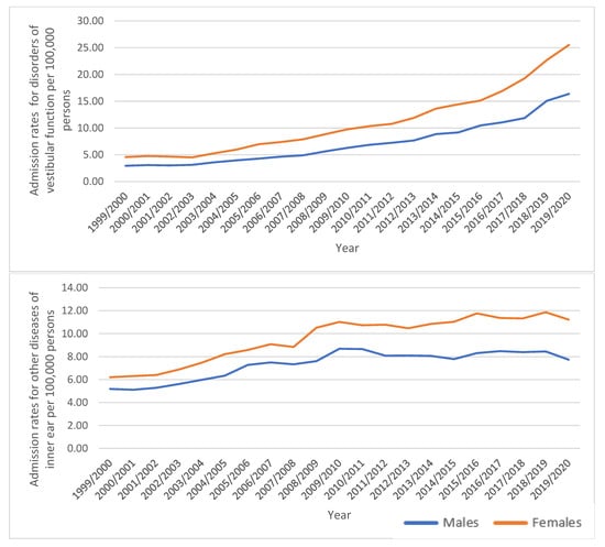 Our finding showed that the total annual number of diseases of the inner ear hospital admissions for various causes increased by 234.8% from 5704 in 1999 to 19,097 in 2020, representing an increase in hospital admission rate of 192.3% [from 10.94 (95% CI 10.66–11.22) in 1999 to 31.98 (95% CI 31.52–32.43) in 2020 per 100,000 persons, p < 0.01]. The increased admission rates can be justified by the increased prevalence rates of diseases of the inner ear with time. For instance, the 2003 prevalence of vestibular vertigo in Germany, as reported by Neuhauser et al. (2009), was 4.9%, while it was 6.5% in 2015 [,]. Similarly, Lai et al. (2011) reported a prevalence of 3.1% of vestibular vertigo in Taiwan, while a higher documented estimated prevalence rate (5.0%) was reported three years later [,]. Indeed, laboratory testing for inner ear disorders has improved in recent years, and consequently, vestibular apparatus examination has become feasible, and vestibular disorders, therefore, can be diagnosed more frequently [].