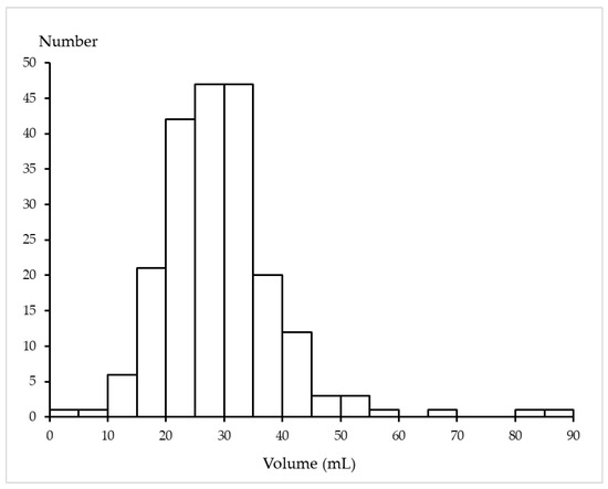 The distribution of the crude prostate volume is shown in Figure 2. The mean crude prostate volume was 29.1 ± 10.3 mL, ranging from 2.8 mL to 88.0 mL. The mean crude prostate volume in each age group is shown in Table 1. The mean crude prostate volume according to the postmortem duration was 28.8 ± 11.1 mL in decedents with a postmortem duration of ≤48 h and 29.5 ± 8.8 mL in decedents with a postmortem duration of >48 h, and the difference was not statistically significant (p = 0.627).