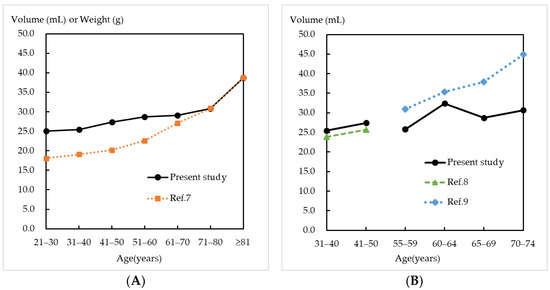 Next, we compared the obtained crude prostate volume of each age group with the previous studies. The results of comparisons to previous results measured at autopsy [7] are shown in Figure 3A, and the results of comparisons to previous results measured via ultrasonography [8,9] are shown in Figure 3B. In both comparisons, the crude prostate volume increased with age.