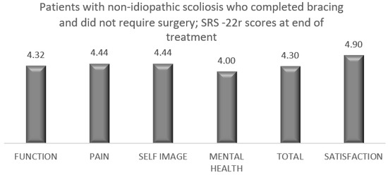 Growing age, especially adolescence, is a transitional period of physical and psychological development that is commonly associated with emotional instability and fluctuation in mood. This can make compliance with wearing an externally visible brace challenging as this is affected by peer pressure, and the effectiveness of treatment requires close collaboration of the patient and his/her family with the surgical and orthotic teams in order to provide maximum support during the length of treatment and foster bracing success. The outcome of any treatment can be defined by the patient’s perception of the results, which is the reason why we included in our analysis a brace questionnaire and the SRS-22r outcome measure. We recorded high patient satisfaction at the latest follow-up among the groups that completed bracing, with or without the need for scoliosis surgery. This was associated with normal function, good self-image and reduced pain at the end of the scoliosis treatment (Table 7, Figure 1, Figure 2, Figure 3 and Figure 4).