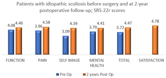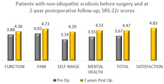 All 84 patients with IS (AIS/JIS) who underwent bracing and surgery completed the SRS-22r questionnaire and reported improvement in the total and domain scores between preoperative and minimum 2-year postoperative with a mean satisfaction rate of 4.78 (Figure 3). In total, 22 patients with non-IS who underwent bracing and had scoliosis correction completed the SRS-22r questionnaire reporting improvement in total and domain scores with a mean satisfaction rate of 4.83 (Figure 4).