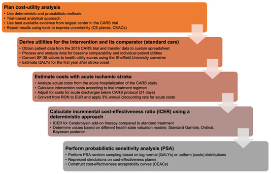 Using deterministic and probabilistic approaches, we conducted a cost-utility evaluation to compute the incremental cost-effectiveness ratio (ICER) for Cerebrolysin, drawing on information gathered from multiple sources. Deterministic methods (using fixed input values) in economic evaluations involve calculating cost-effectiveness using single-point estimates for all input parameters, such as costs, effectiveness and utilities. This approach does not account for uncertainty or variability in the input parameters, and thus, the results may not reflect the full range of possible outcomes. Probabilistic methods (incorporating uncertainty) in economic evaluations, on the other hand, use probability distributions for input parameters to account for uncertainty and variability. By performing multiple simulations, these methods generate a range of possible outcomes, providing a more comprehensive understanding of the cost-effectiveness and the likelihood of different scenarios occurring. Due to the nature of data collection (secondary analysis of clinical trial data; extraction of anonymized and aggregated cost values for various care scenarios), Institutional Review Board approval was not required for this study. To simulate patient pathways and costs, we selected the main care setting from the only available clinical trial that may be used to derive utilities for inpatient acute ischemic stroke care, based on the dominant participating country (Romania). This analysis was performed from the perspective of the payer, based on a predefined sequence (Figure 1).