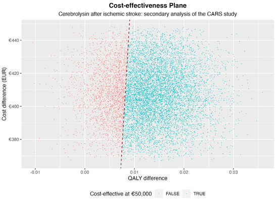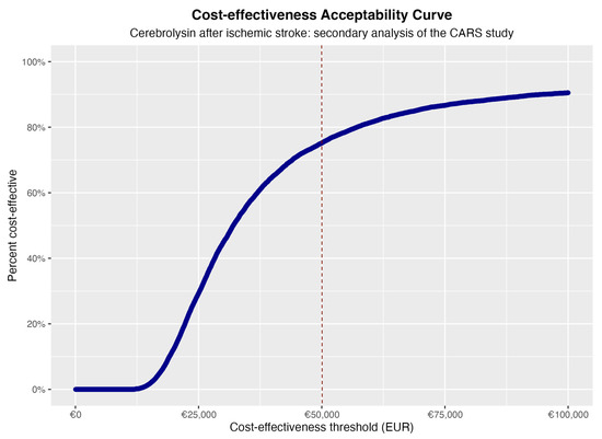 Based on the CARS trial patient pathway, the Cerebrolysin add-on treatment was cost-effective in roughly 80% of cases for an ICER threshold set at 50,000 EUR (Figure 2 and Figure 3), considering only the 90-day timeframe of the CARS-study.
