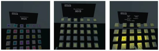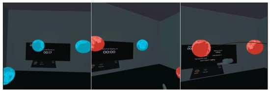 Our study utilized a virtual environment designed to immerse rehabilitants in a visually engaging room set in outer space. This environment features visually represented button objects that trigger user actions to initiate the games. Each exercise session is organized into five rounds per task, with each round lasting approximately 45 to 75 s, depending on the individual user’s performance. During the exercises, real-time feedback was provided to the rehabilitants through visual and auditory cues, informing them if the exercise was being executed correctly or if adjustments were needed. Furthermore, a summary of the user’s performance was displayed, providing feedback on their progress, and achievements were shown after each finished round. This structure encourages rehabilitants to strive for improvement and helps them track their rehabilitation progress throughout the session.