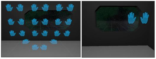 Inspired by the forward-reaching movement pattern applied by Thrasher et al. in their study [39], the third task challenges users to touch pairs of hands (left and right) from their respective sides. The left hand must reach the left-hand object, while the right-hand reaches the right-hand object. Both hands need to simultaneously reach the target hands within 0.5 s to proceed to the next pair of hands. In a single round, nine different target positions appear in random order, and the same pair does not reappear within the same round. This exercise promotes shoulder movement and elbow flexion for upper extremity rehabilitation while offering bimanual benefits. The simultaneous use of both hands enhances bilateral coordination and motor control, which are essential for performing daily activities. For a better understanding of the third task exercise layout and design, please see Figure 3.